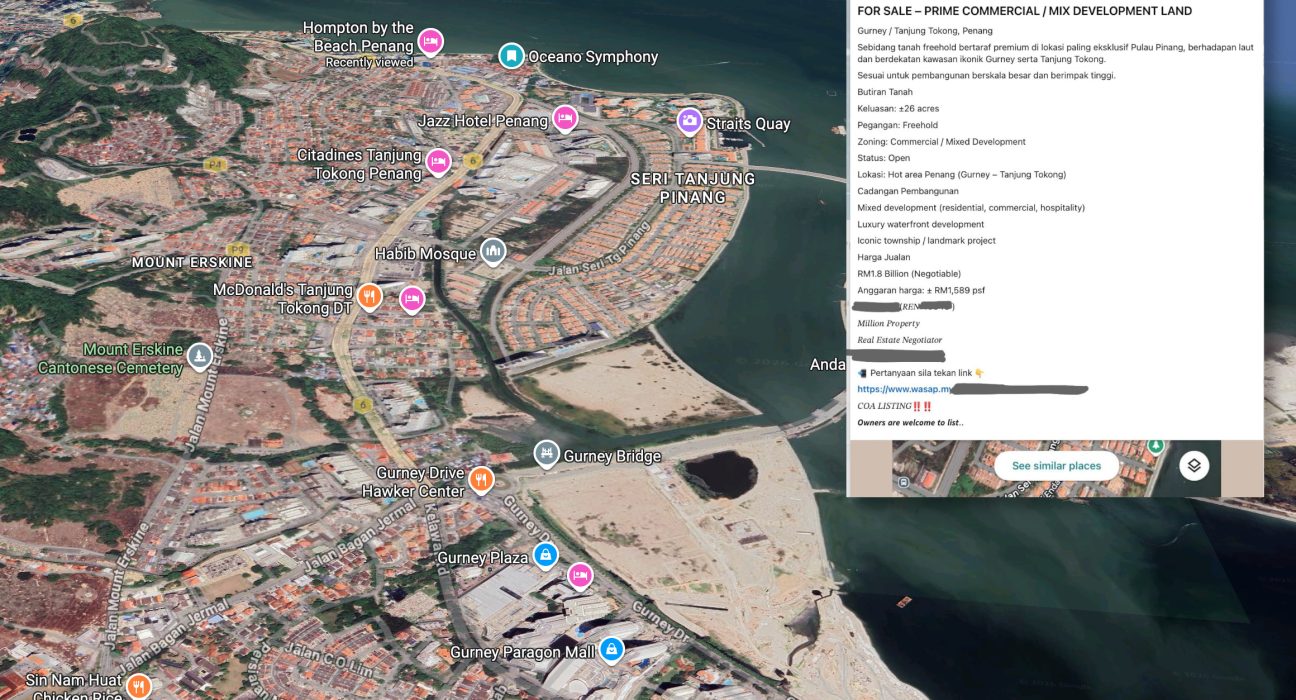 A prime parcel of reclaimed waterfront land near Gurney Drive has recently surfaced in the market, drawing attention from property observers and industry insiders. The site, measuring approximately 26 acres, is reportedly being marketed for sale by property agents as a potential large-scale mixed development opportunity in one of Penang Island’s most prestigious coastal corridors.